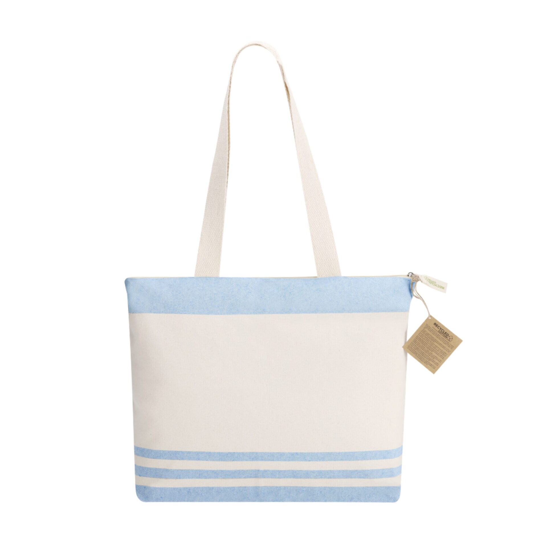 Élégant et responsable, ce sac en coton recyclé séduit par son ton naturel et ses rayures colorées. Son format avec soufflet offre une belle capacité, idéal pour un usage quotidien. Doté de poignées longues renforcées, il allie confort et solidité.