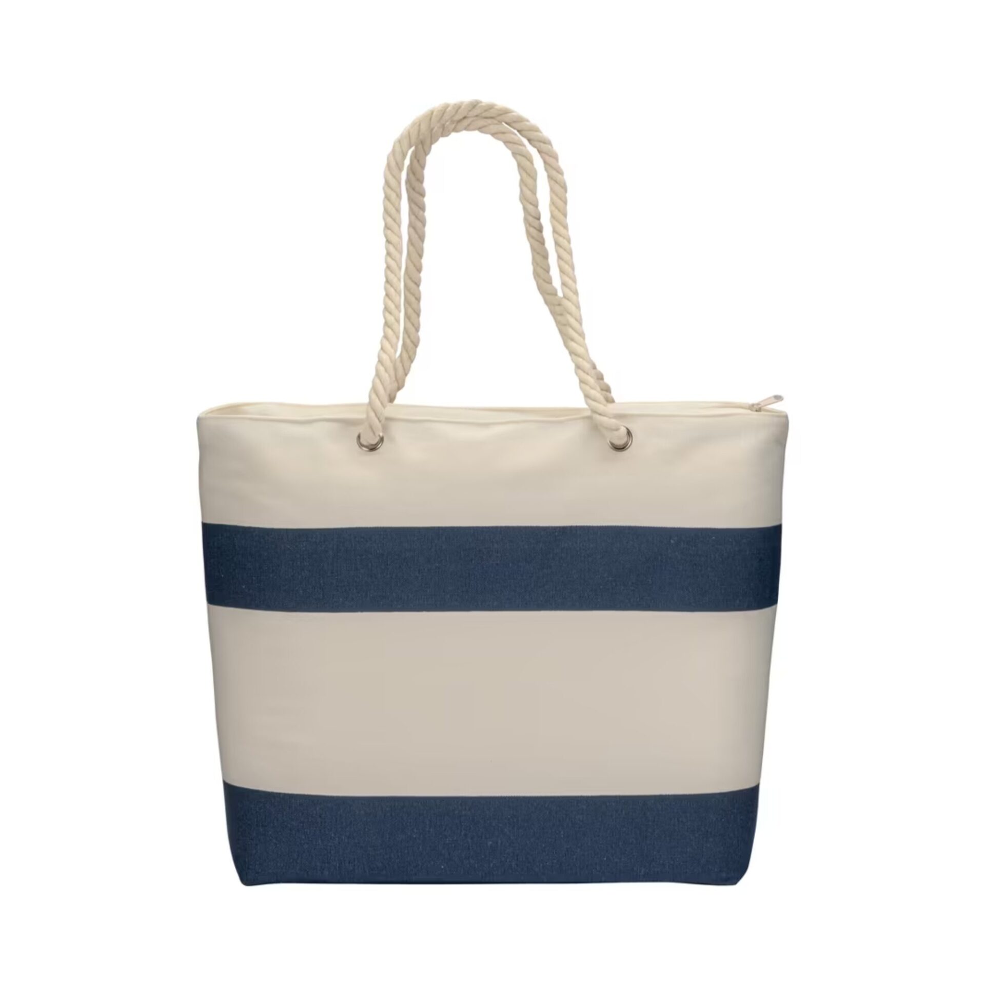 Rayures marines, anses en corde et coton recyclé 280 g/m² : ce sac de plage a tout de l'objet estival qui fait l'unanimité. Son soufflet offre un volume confortable pour emporter l'essentiel, et son look marin intemporel porte votre marque avec style.
