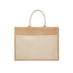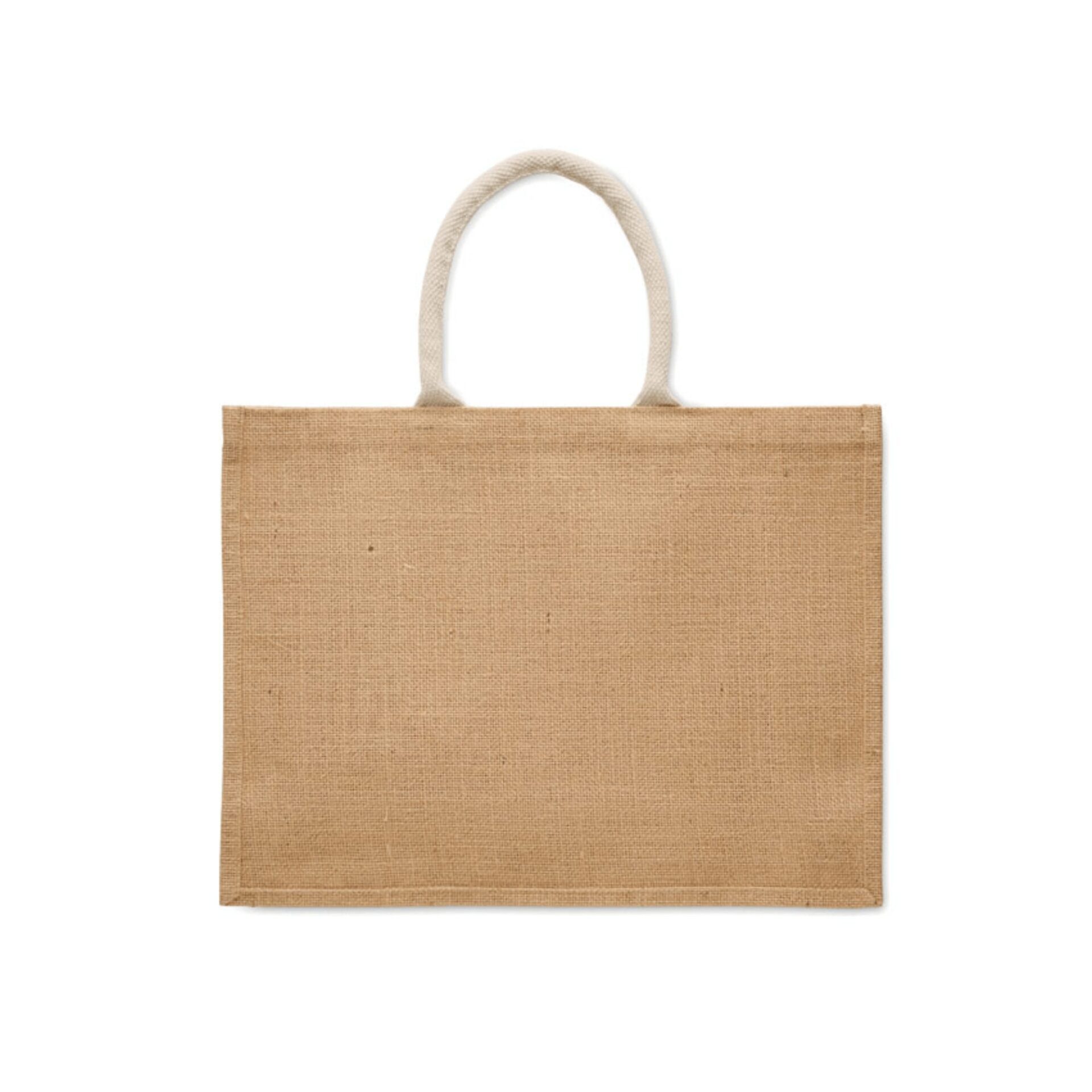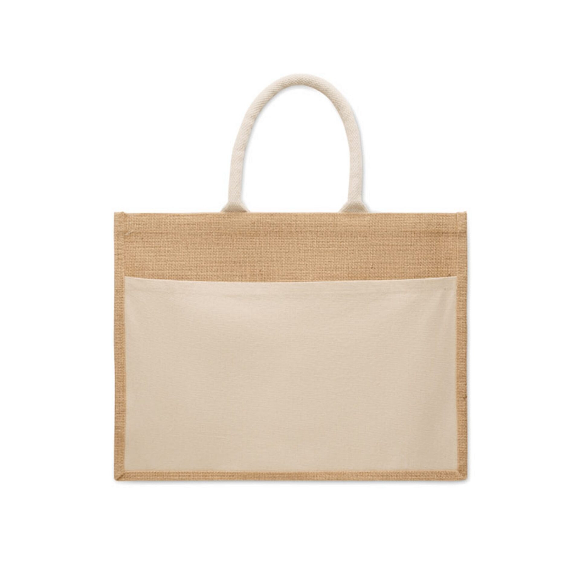 Ce sac shopping au style naturel associe élégance et praticité pour vous accompagner au quotidien. Ses poignées en corde offrent une prise en main confortable, tandis que sa grande poche frontale permet de garder vos essentiels à portée de main. Spacieux et robuste, il est idéal pour les courses, les sorties ou les événements. Son mélange de jute laminé et de toile de coton lui confère un aspect authentique qui valorise parfaitement une image de marque soignée et tendance.